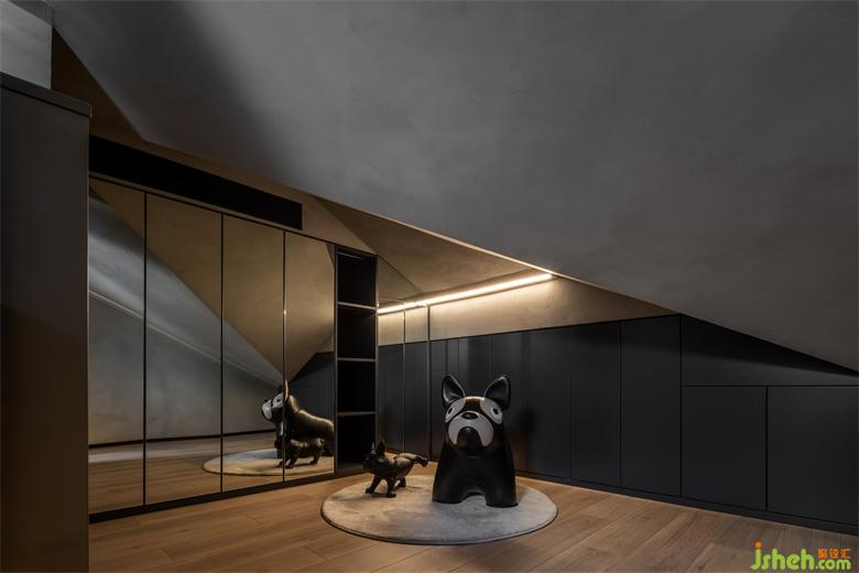 項目背景:原始戶型是頂層帶閣樓,我們打破原始的居住理念,融府裝修設(shè)計將主臥安排在二層的閣樓上,一層則留一間客房,供長輩或親朋偶爾居住。并將整體一層作為家庭娛樂的重要場所。值得一提的是,我們將原建筑結(jié)構(gòu)中的一層客廳與臥室空間互換,打破既定思維模式,讓規(guī)劃后的客廳與公共空間更和諧、動線也更合理,同時也能兼顧樓梯的動線與人體工學(xué),讓去往二層的樓梯空間更舒適、更安全。在色彩應(yīng)用方面,我們結(jié)合業(yè)主喜好選擇了深灰色系,高品質(zhì)的凝現(xiàn),加之金屬不銹鋼和清水混凝土的運用,為空間增加不同質(zhì)感的生命力、精氣神。每一件小物都經(jīng)過精挑細(xì)選,只盼物有所愛,人有所歸。