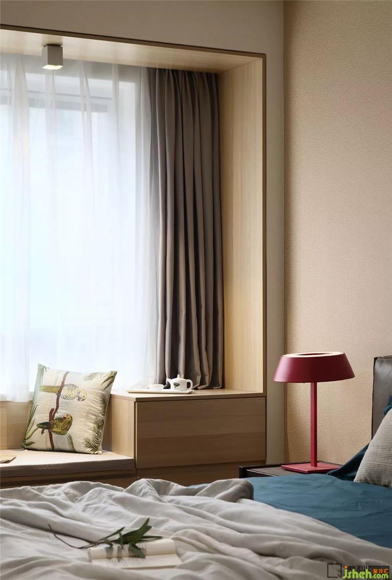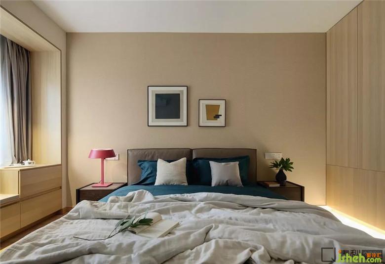 客臥設(shè)計(jì)十分簡潔,沒有多余裝飾,床品的色調(diào)和墻色保持一致,室內(nèi)設(shè)計(jì)師為了營造溫馨感和賓至如歸感,用淺色原木色與與其接近的裸色及駝色來打造。特別挑選的掛畫進(jìn)一步提升了空間的品質(zhì)。