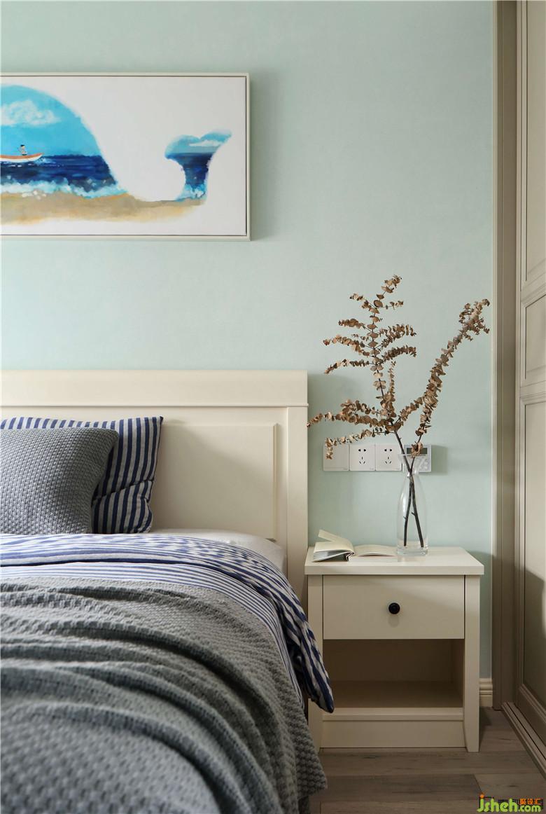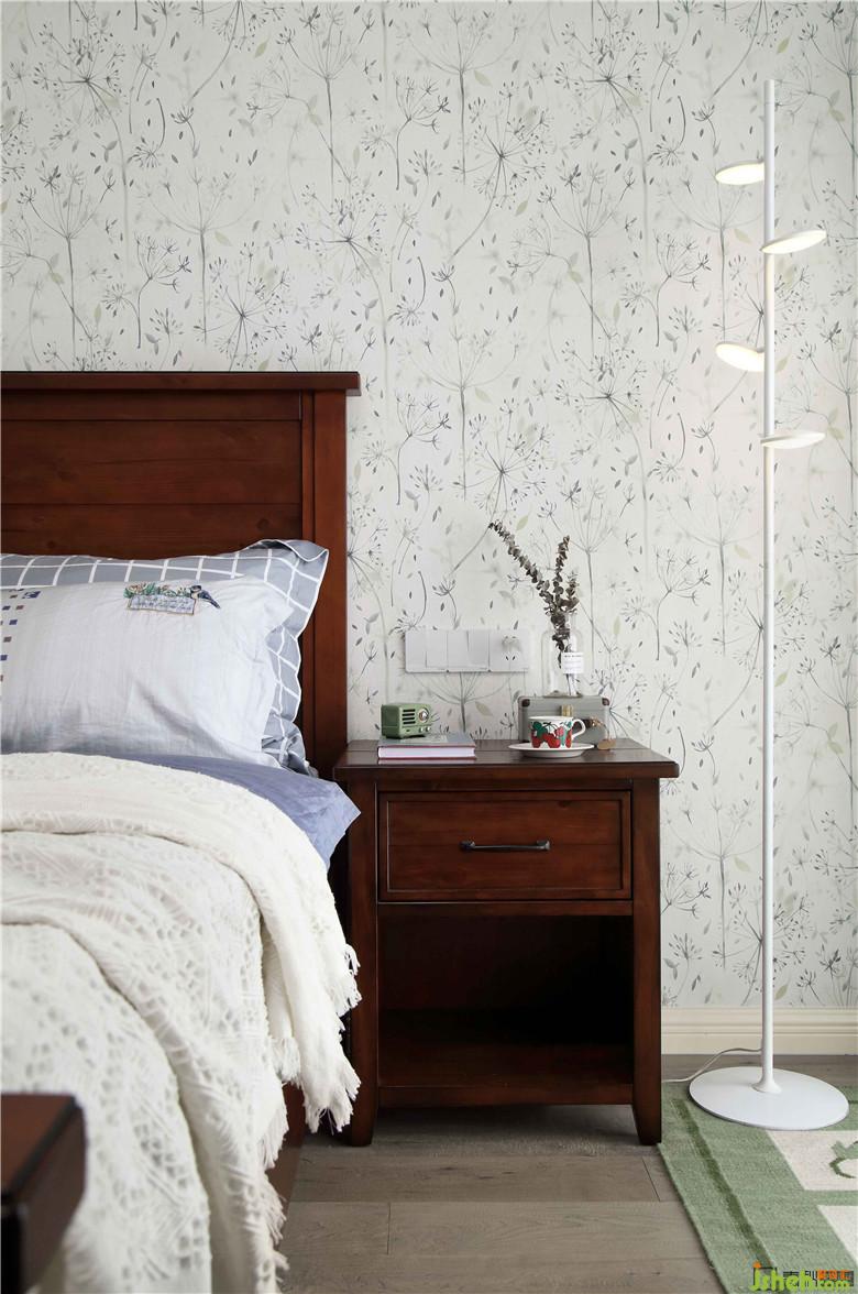 主臥室內(nèi)設(shè)計(jì)師延續(xù)客廳的風(fēng)格,明度適中的綠植墻面,帶著獨(dú)特的寧?kù)o韻味,讓人放松入眠。