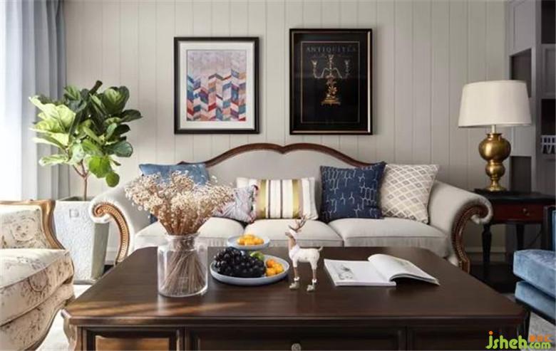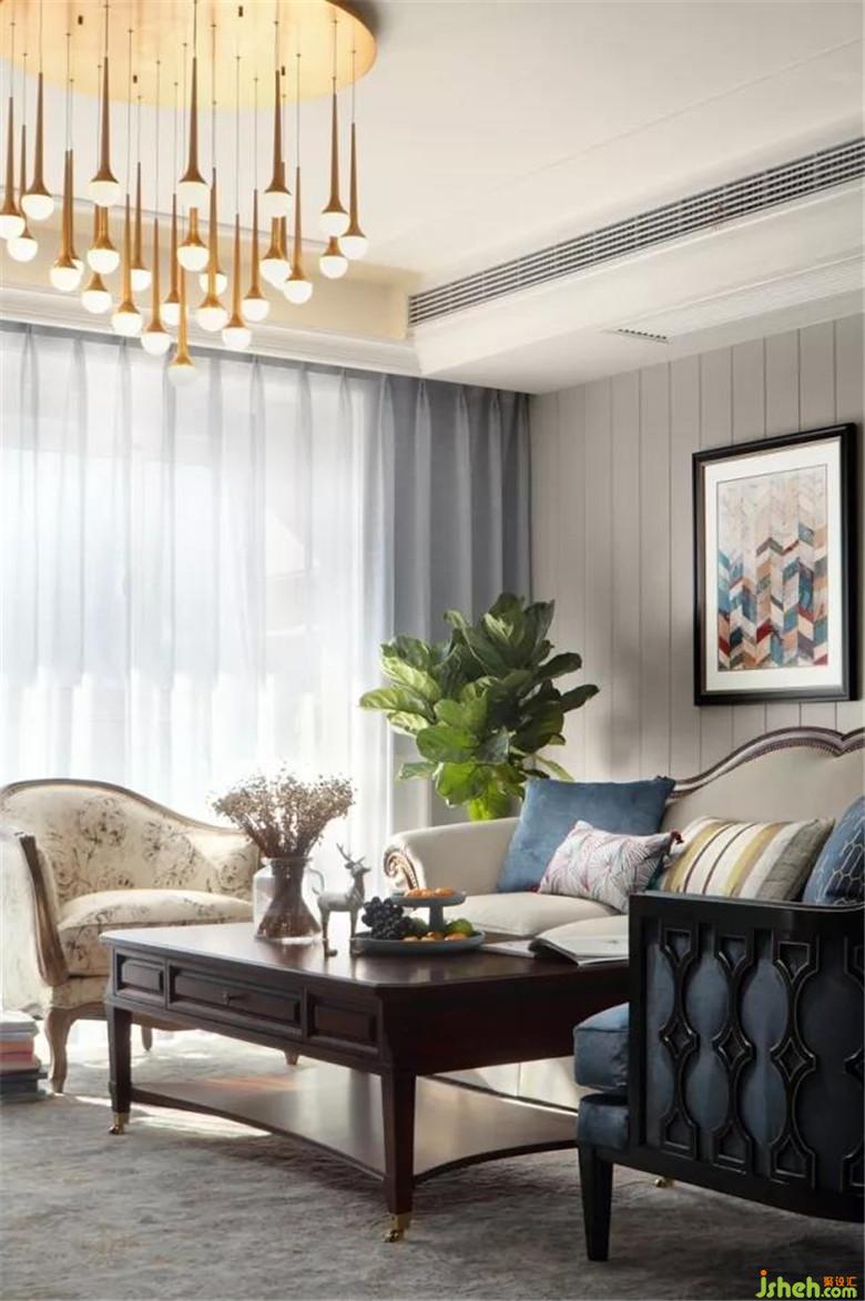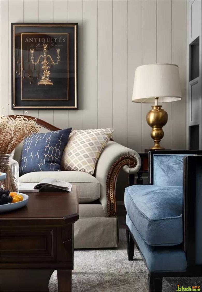 干凈的米色沙發(fā),整體看起來非常溫馨,室內設計師用乳黃和深藍色作為跳躍感點綴,溫馨又不失活潑,沉穩(wěn)大氣。