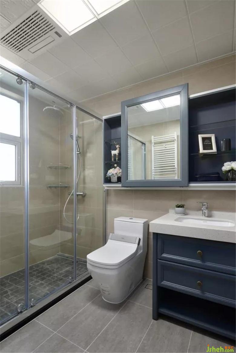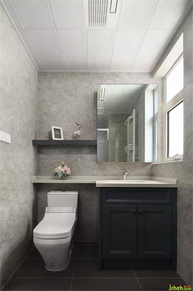 衛(wèi)生間設(shè)計(jì)了滑動(dòng)鏡面柜門(mén),壁掛式的鏡箱收納柜大大節(jié)省了空間。