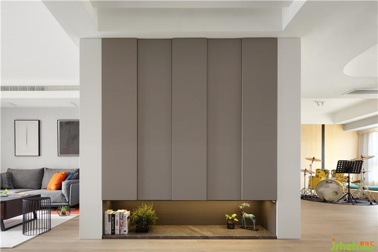 大門正對面看似一面裝飾墻,實為一組隱藏的柜門,內(nèi)部是一個很實用的次凈衣收納柜和鞋柜收納的結(jié)合,使用后的隱形門完全隱入墻體之中,成了一面沉靜的墻。