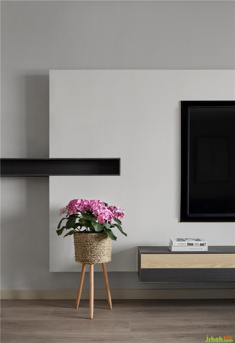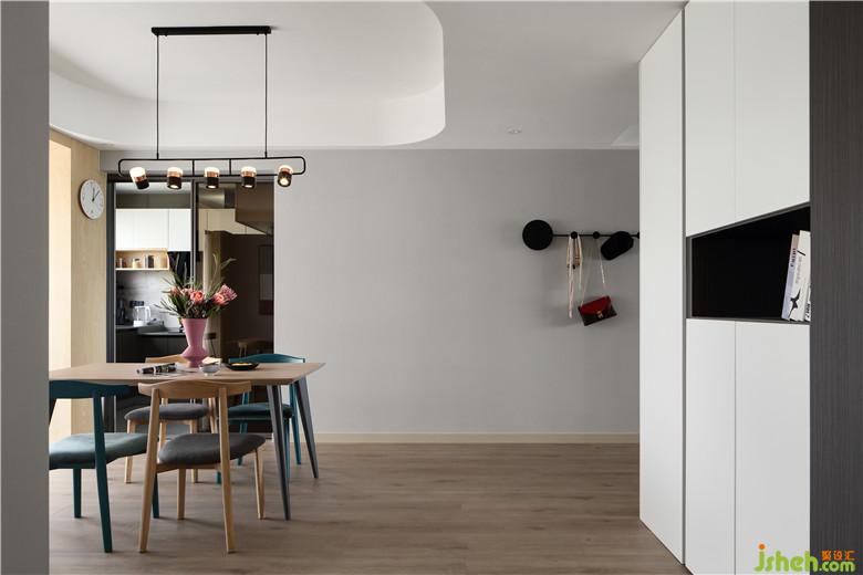 進門左手邊的一條小暗格,與客廳的電視機色系一致,遙相呼應(yīng),放些小裝飾品、鑰匙、小擺件,平時常用的小東西有了溫馨的小家,不顯凌亂。進門右手邊設(shè)計了一個掛圍巾和包的掛鉤墻面,即走即用,拿取方便。