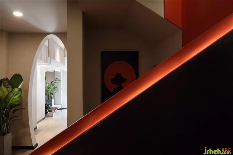 舍去傳統(tǒng)的欄桿扶梯,紅黑搭配的樓梯是樓下樓上色系的銜接色,為樓上房間的色調做了完美的鋪墊。
