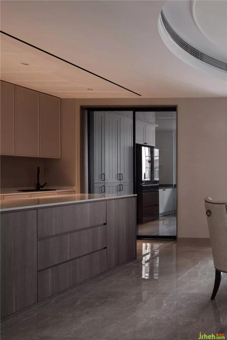 餐桌另一側(cè)的西廚,將多余的空間利用,別出心裁的吊頂設計,以線條修飾,讓空間在開放的“形”之下,擁有獨立的“意”。