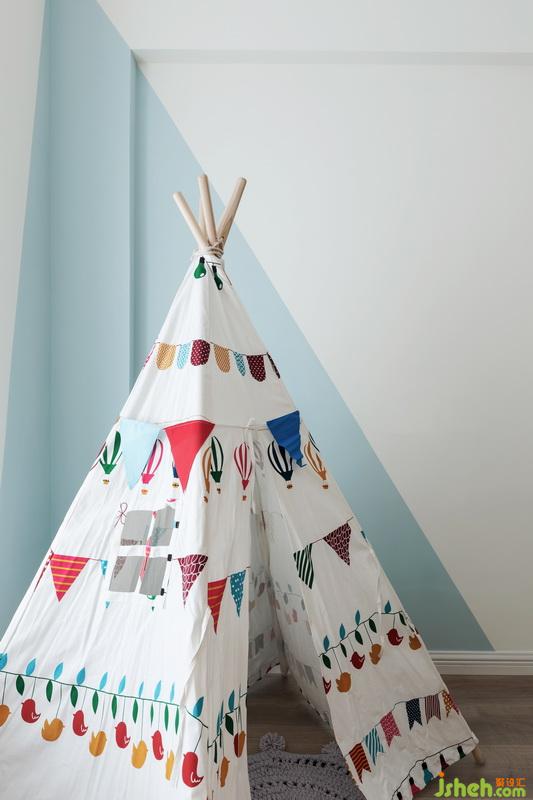 兒童房在施工中途得知這個家庭即將迎來第二個小生命,所以床換成高低床滿足所需;基礎(chǔ)色也以中性色為主色調(diào),室內(nèi)設(shè)計師采用清新的天空藍撞入空間。利用轉(zhuǎn)角墻體進行色彩插入;配合玩耍小帳篷讓兒童房增添一些童趣和玩味性。