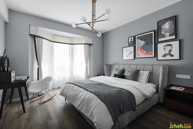 主臥好比一曲爵士樂;灰色層次是它的節(jié)拍,組合掛畫、金屬吊燈、梳妝桌椅隨著節(jié)拍即興搖擺,靜靜感受這種律動帶來的儀式感。