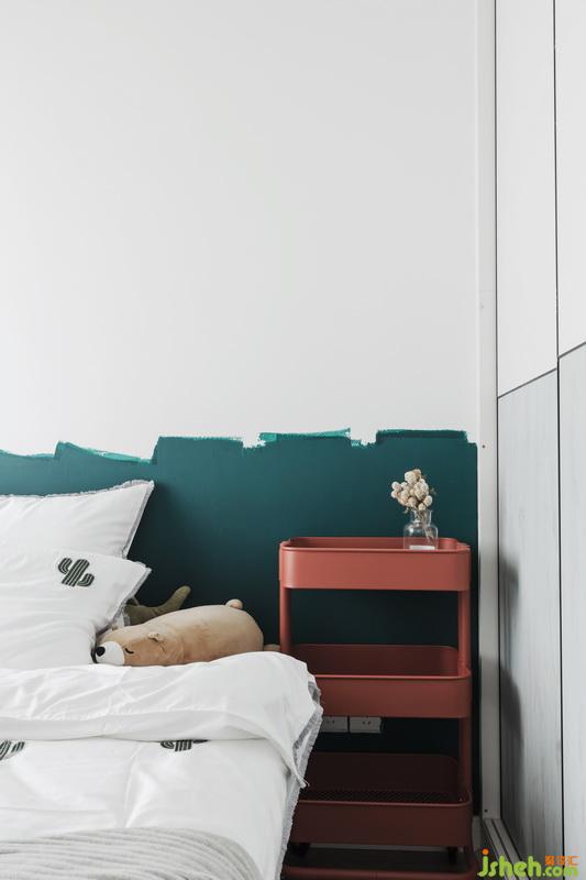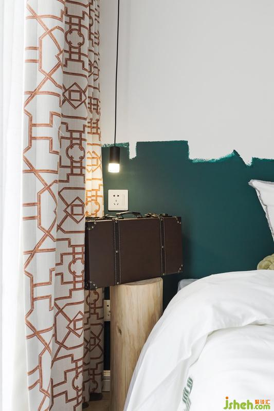 由于空間尺度的限制,也因?yàn)闃I(yè)主孩子小個(gè)子的身高,室內(nèi)設(shè)計(jì)師采取了定制床尺寸,縮減到1.4M*1.9M,讓空間更合理的利用,有了壁掛木臺(tái)面的小小梳妝位。床頭小吊燈是孩子的最愛,橙色紋理的窗簾與半高綠色床頭背景在燈光的映襯下,讓孩子總愛窩在這里,放空自己。