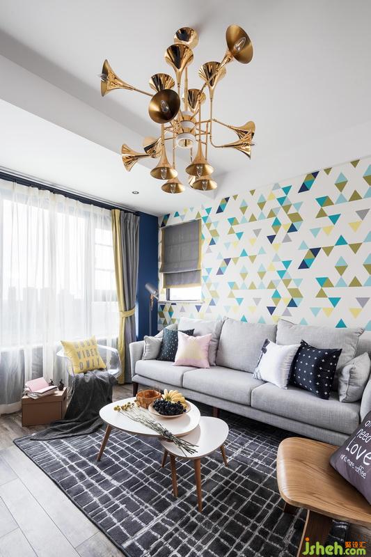 4、主要用材:強化木地板,色彩乳膠漆,幾何墻紙,成品家具