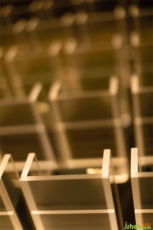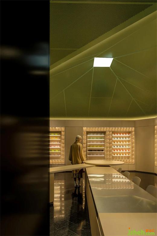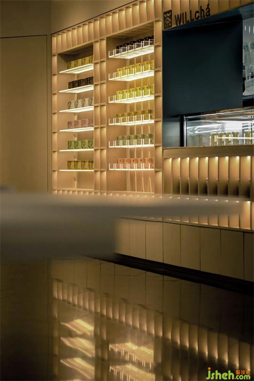門口的抱柱櫥窗和室內(nèi)墻面展示架內(nèi)部的折面,均來源于東方的“折扇”這一元素。旗艦店設(shè)計(jì)進(jìn)入空間內(nèi)部,映入眼簾的便是陣列感十足的茶品展陳架。CUN用一種連貫的手法統(tǒng)籌所有立面,使同一材質(zhì)和表現(xiàn)元素貫穿始終,其中更加入了“亞克力U形架”等獨(dú)有設(shè)計(jì),讓整個(gè)空間立面在統(tǒng)一、震撼且純粹的基礎(chǔ)上,多了一份變化與不同。