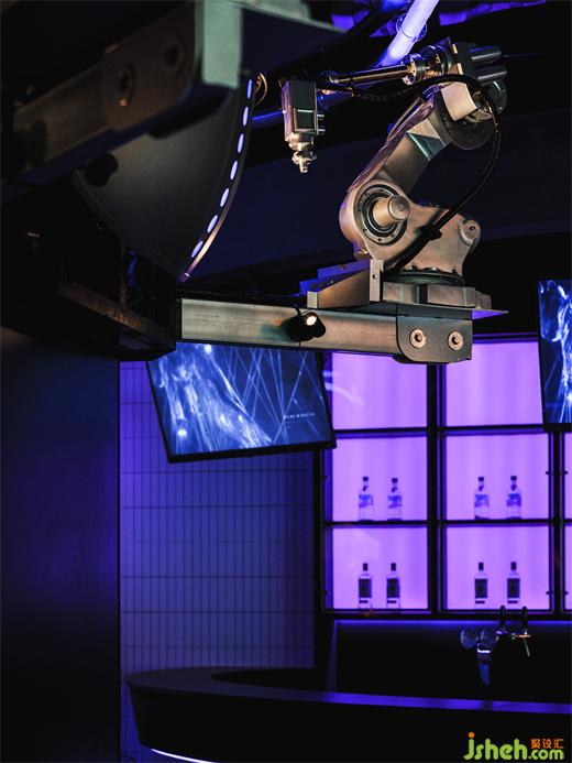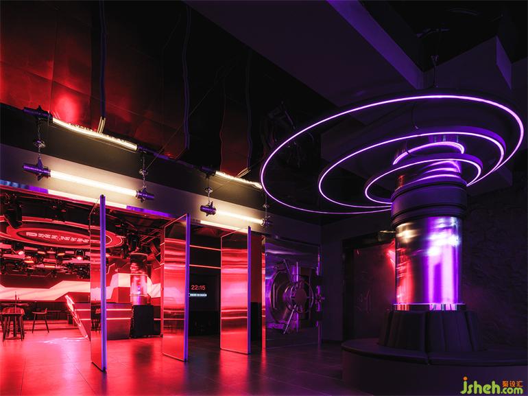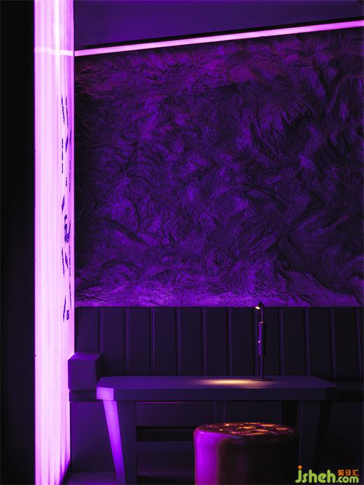 吧臺(tái)區(qū)的LED燈帶利用動(dòng)態(tài)的數(shù)字內(nèi)容快速提升空間氛圍和娛樂(lè)趣味,作為點(diǎn)綴的金屬構(gòu)架在霓虹燈的映照下,俱樂(lè)部設(shè)計(jì)帶有來(lái)自未來(lái)的機(jī)械美感。部分吧臺(tái)主體采用玻璃磚堆砌而成,平衡了輕盈與厚重之間的美感,將霓虹光吸納其中。