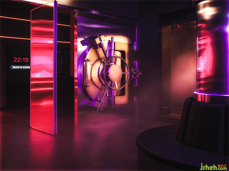 一面是全落地的多媒體LED顯示屏幕墻,一面為可移動(dòng)折疊的覆蓋金屬材料的簡(jiǎn)潔矩形體塊及壓力艙門,另一面則為粗糲的、原始的石材墻面,俱樂(lè)部設(shè)計(jì)獨(dú)具對(duì)比性的空間呈現(xiàn)出明亮與昏暗、開(kāi)放與封閉,連續(xù)性與非連續(xù)性的狀態(tài)。