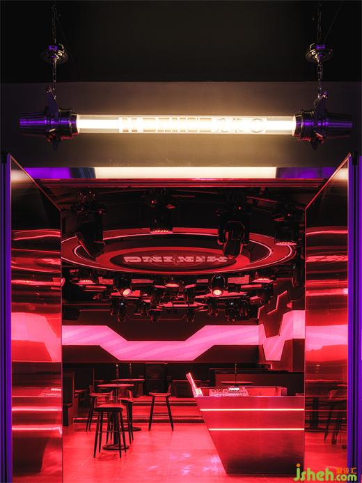 從吧臺(tái)一側(cè)走入交互通道,通道盡頭的鐳射裝置射出紅色光束勾畫(huà)出空間輪廓,俱樂(lè)部設(shè)計(jì)并在地上投射出相應(yīng)信息,同時(shí),從上而下的光束為路過(guò)的客人創(chuàng)造出與空間之間的互動(dòng)更多形式。