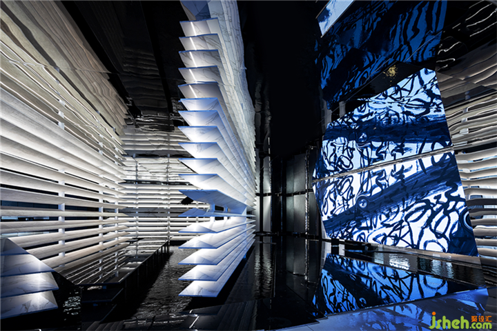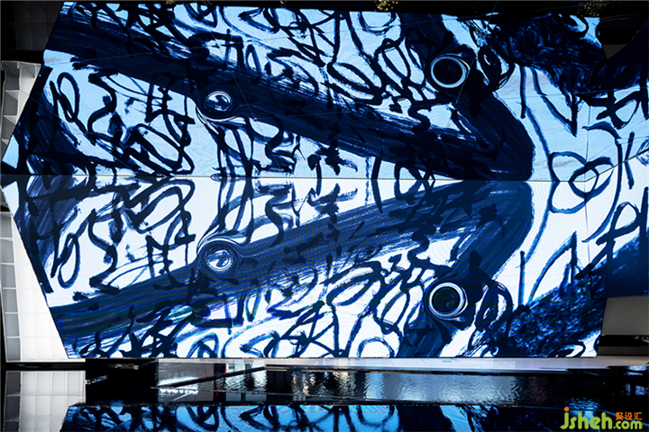 若停下腳步仰望,會看到空間中不規(guī)則出現(xiàn)的幾何體,它們或懸空、或倒置、或依附,時而反射水光粼粼,展廳設計時而映照線條變幻,像極了峽谷中的崖石,那是在大的雄渾中而清晰存在的小的精微。