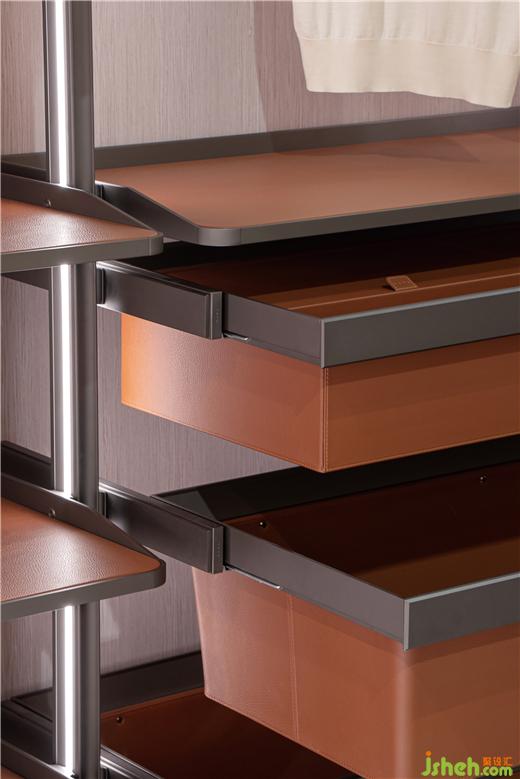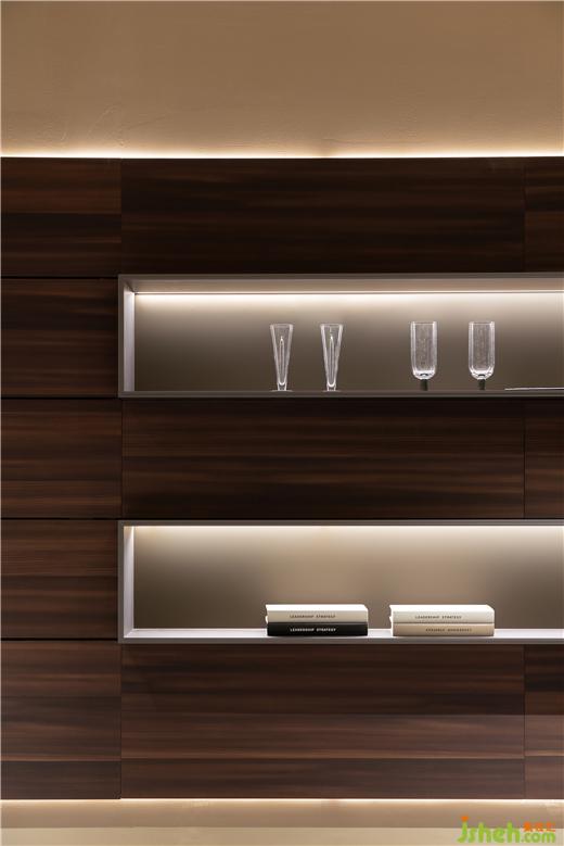 入內(nèi),多元的品質(zhì)化生活場景徐徐展開,光影流轉(zhuǎn),移步換景,衣柜、博古柜、隱形門,墻板展示等與空間進行有效融合,細節(jié)質(zhì)感考究。全屋定制展廳設(shè)計通天書柜尤為出彩,即為隔斷,在藏與露之間營造多層次的透視關(guān)系,又在視覺上與弧線寰宇框架成交錯狀態(tài),提供豐富的線條變化。