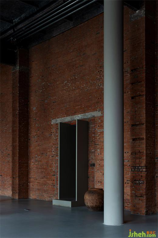 兩個空間有彼此完整獨立的動線但以通道相連,猶如一個古代院落的前庭與后院?!刚l園」作為「誰最中國」的美學(xué)空間,沒有像通常藝術(shù)畫廊那樣做純白色調(diào)性的處理,而是通過剝離原本墻面的抹灰,辦公室設(shè)計讓空間回到最原始的樣子,6米挑高的空間中,僅克制的留下幾處渾圓的灰色立柱頂天立地,在人的尺度之上創(chuàng)造出的空曠與留白是空間精神性的物質(zhì)基礎(chǔ),60多年前的紅磚從功能主義的立面變身成為時代舞臺上一面新的幕布。