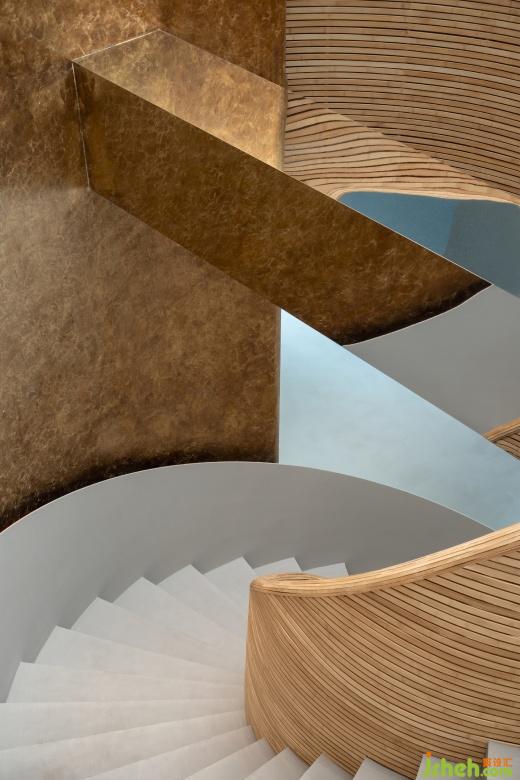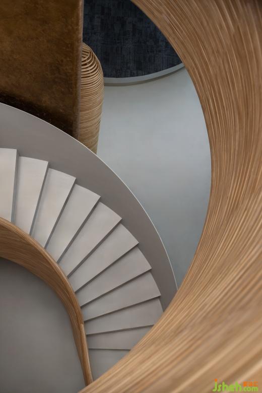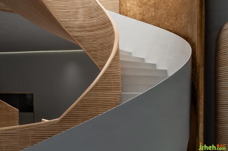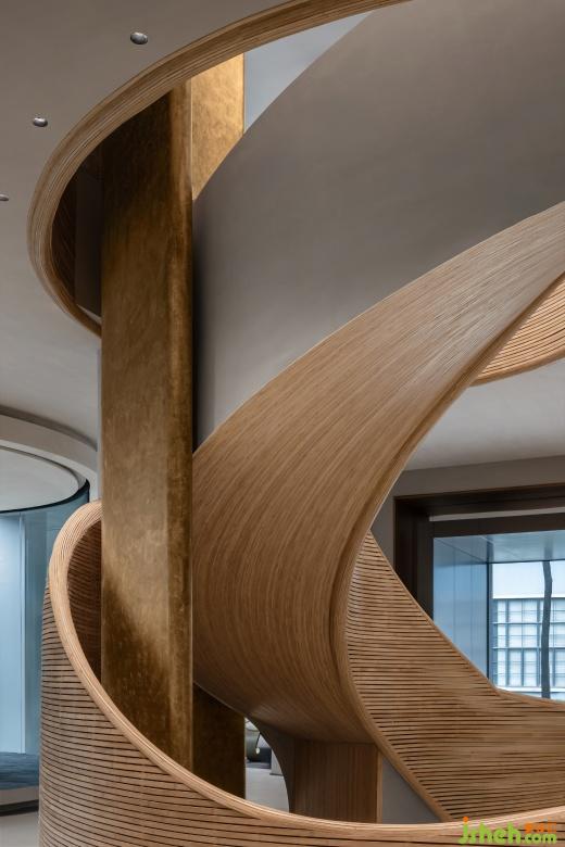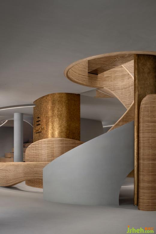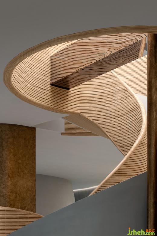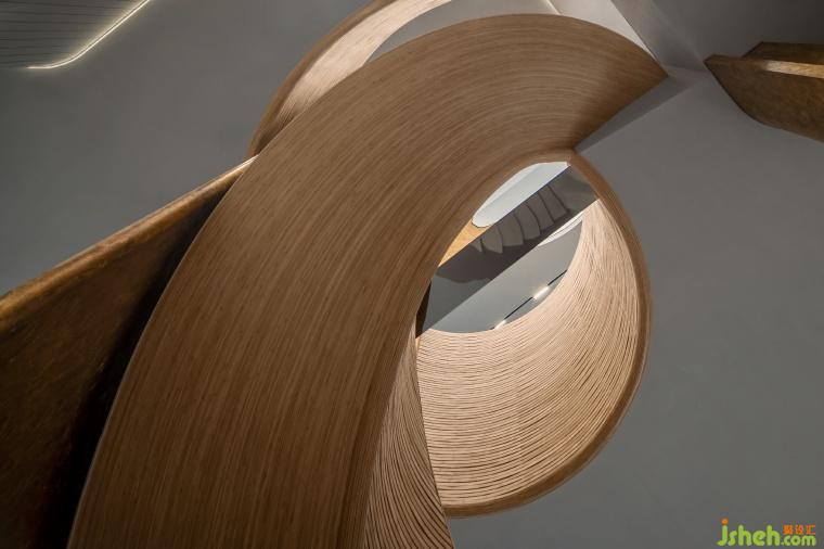 辦公室設(shè)計(jì)細(xì)竹木編織而成的接待前臺(tái)猶如掀起的巨浪,繼續(xù)纏繞著旋轉(zhuǎn)樓梯,如漩渦一般,蜿蜒攀升至二樓。