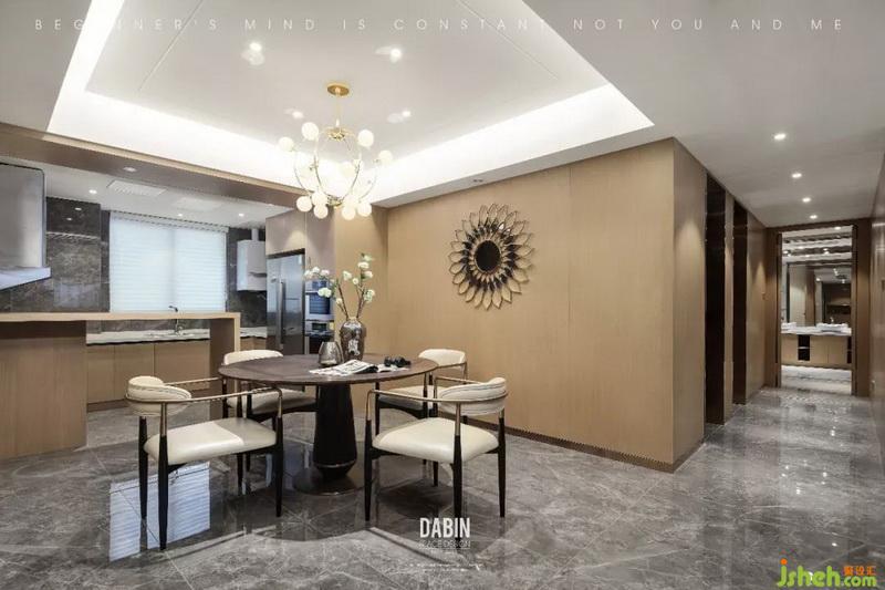 餐廳安置了胡桃木色餐桌,餐椅同樣有金色的出沒,呼應(yīng)了整個(gè)空間的輕奢主題,也讓這個(gè)正式的用餐環(huán)境變的文藝高貴。可以想象業(yè)主一家其樂(lè)融融在此盡享幸福時(shí)光。