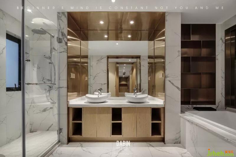 主衛(wèi)室內(nèi)設(shè)計(jì)師采用干濕分離,大面積的金色包邊搭配大理石材質(zhì)、雙臺(tái)盆,盡顯奢華酒店風(fēng),讓業(yè)主美好的早晨,從洗漱環(huán)節(jié)便可以很自信的開始。