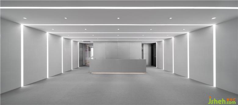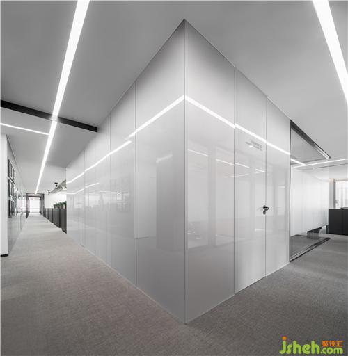▼走廊背景為灰色背漆玻璃,頂部細(xì)長(zhǎng)的燈帶增加縱深感
