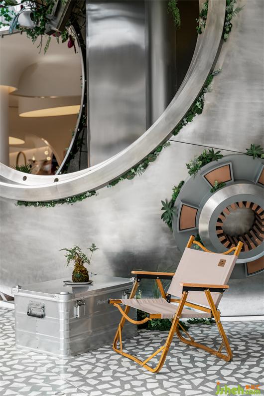 咖啡操作臺(tái)是由廢舊的艙體演變而來(lái),在經(jīng)過(guò)打磨后,它似乎又煥然一新了。機(jī)艙蓋的燈光使整個(gè)咖啡操作區(qū)域變得明亮,也增添了一絲神秘的色彩。周邊是在廢墟上自然生長(zhǎng)的植被。