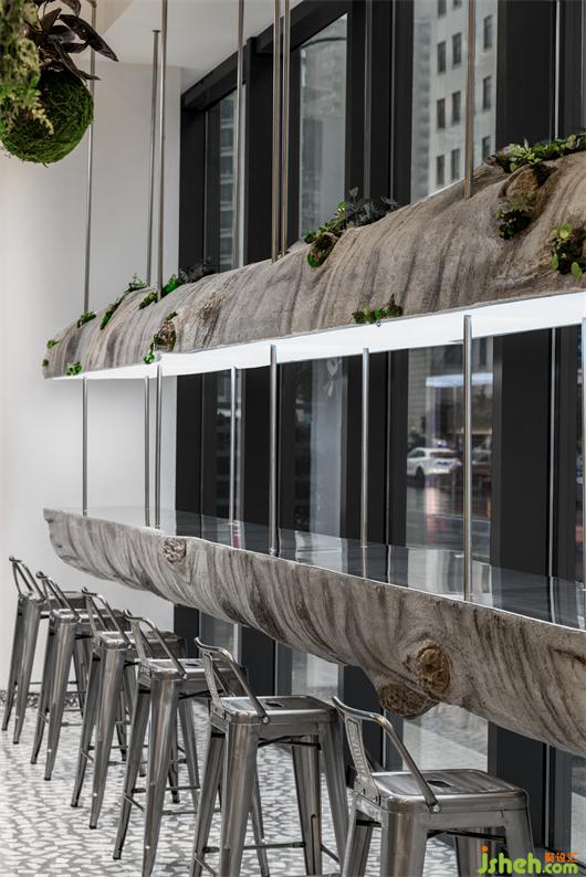切開(kāi)樹(shù)木,不是熟悉的木質(zhì)纖維,而是光滑的鏡面般金屬物質(zhì)??Х戎圃炀衷O(shè)計(jì)樹(shù)木飄浮在空中,詭異的截面反射著這個(gè)美好卻又陌生的世界。