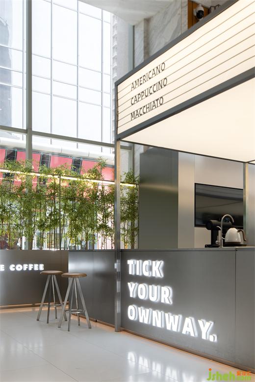本店的客群主體是匯錦金融中心是工作的人,設(shè)計(jì)希望為他們提供一個(gè)工作間隙與好友放松聊天會(huì)客的場(chǎng)所——“城市會(huì)客廳”。設(shè)計(jì)師通過(guò)咖啡吧臺(tái)方盒子與Ticle品牌標(biāo)識(shí)字母“T”空間穿插組合,圍合成品牌標(biāo)識(shí)字母“T”從人視角看是咖啡會(huì)客區(qū),從大堂高層向下眺望會(huì)是平躺的字母“T”,從多種視線角度展示品牌形象。