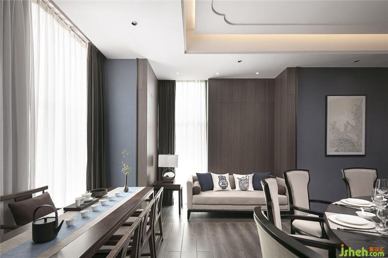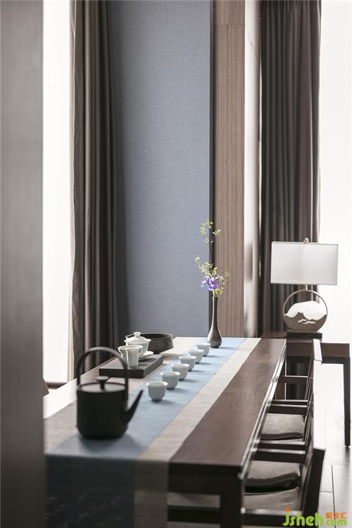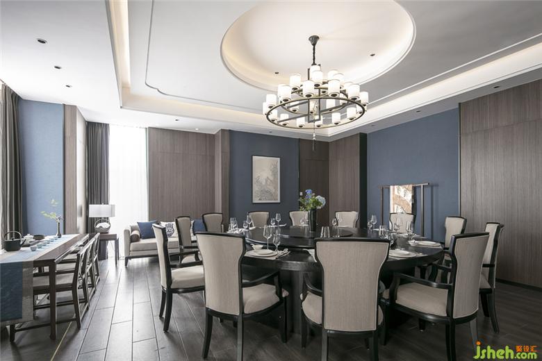 本案運(yùn)用蘑菇石的墻面背景,粗獷有力量。KD的胡桃木飾面板,溫潤而穩(wěn)重。地面覆蓋了兼具防滑功能與自然肌理的巖石質(zhì)感地磚。空間配色為胡桃木色、藍(lán)色、和卡其色系。藍(lán)色是帶有憂郁、天真、冷靜同時(shí)具有皇室的高級感和威嚴(yán)感的顏色??臻g采用胡桃木色木飾面,搭配飽和度低的牛仔藍(lán),營造靜謐穩(wěn)重的就餐氛圍。茶臺和桌面的花依據(jù)時(shí)令進(jìn)行變換,冬天的雪柳臘梅,春天的芍藥牡丹,夏天的藕荷,秋天的紅楓。餐桌上的菜品也是四時(shí)不同。記四時(shí)茶食,賞四時(shí)美景。除了石材木材這些天然的材質(zhì)以外,還運(yùn)用了現(xiàn)代裝飾中常用的砂黑啞光不銹鋼進(jìn)行收口。為了緩解直線條帶給人的剛硬刻板的感受,所有主題墻面均采用山水題材的墻畫。與空間相匹配的氣場,靈動(dòng)的曲線和深淺變化的藍(lán)色,同時(shí)提升了空間的延展性和動(dòng)態(tài)美。將空間比喻成人的話,骨架和靈魂是堅(jiān)韌的,身段是柔軟的。剛與柔,陽與陰的融合。餐廳設(shè)計(jì)