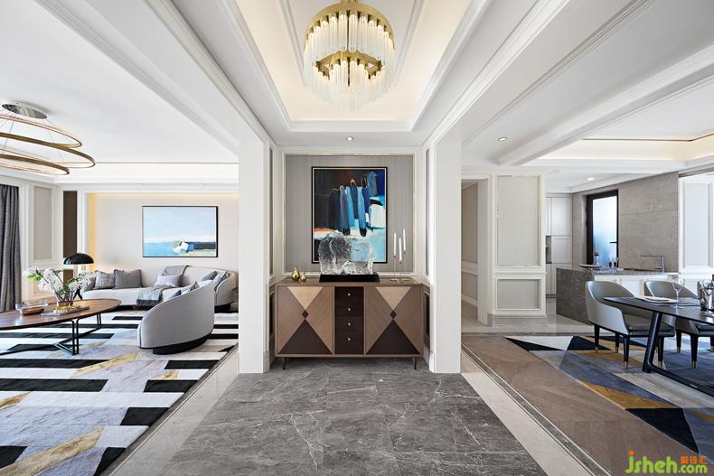 設(shè)計(jì)從把控力的均衡上給人以穩(wěn)定的心理感受,硬裝設(shè)計(jì)提取了歐洲元素并引入法式輕奢格調(diào),不禁想起了塞納左岸的藝術(shù)情懷;軟裝則貫徹現(xiàn)代極簡主義的原則,整個(gè)空間在協(xié)調(diào)中尋求沖突,在微妙的反差中獲得鮮明的互補(bǔ)平衡??臻g中的變調(diào)是色彩引發(fā)的視覺體驗(yàn),顏色合而不同,中性灰作為過渡的中間色不偏不倚,讓其他色彩在其襯映下呈現(xiàn)出最本質(zhì)的面貌,一切都那么自然而然。