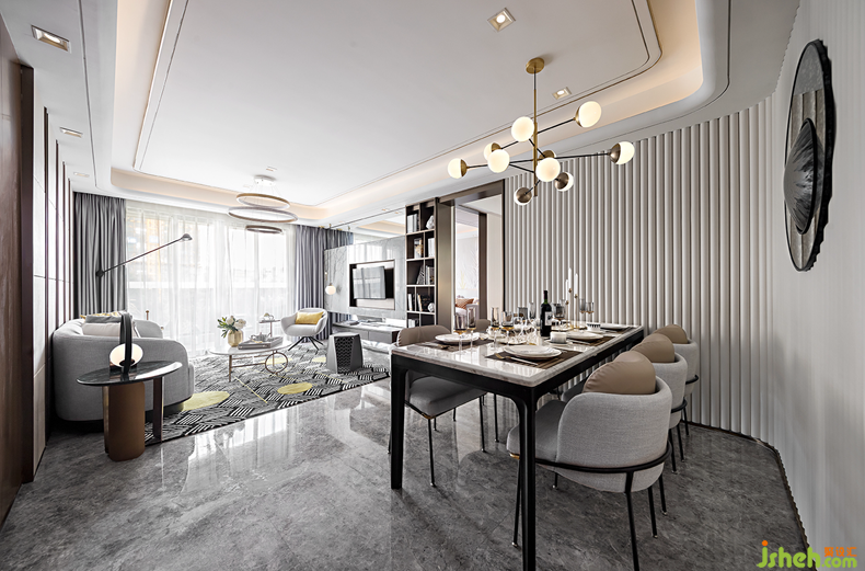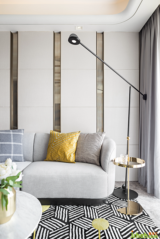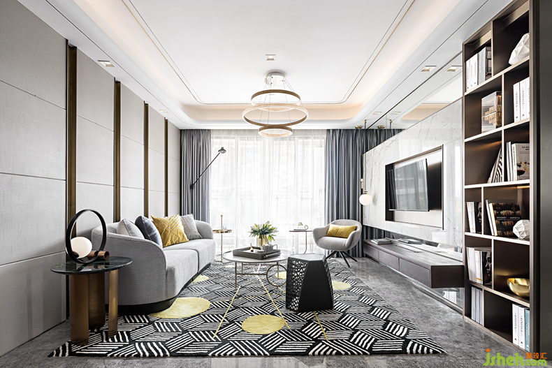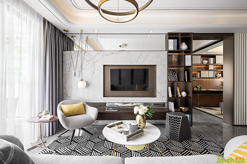 品質(zhì)體現(xiàn)于對細節(jié)的處理,動靜有序,現(xiàn)代而不失沉穩(wěn),設計師用心地在其中找到平衡。圓角造型的沙發(fā)、幾何圖形的地毯和圓環(huán)形的吊燈等陳設的搭配,讓空間顯得優(yōu)雅而有趣味。