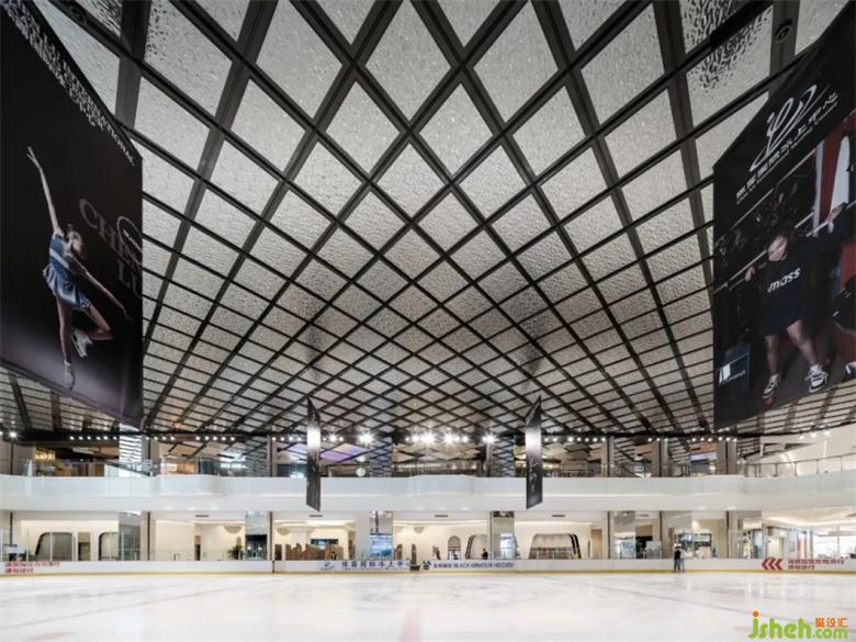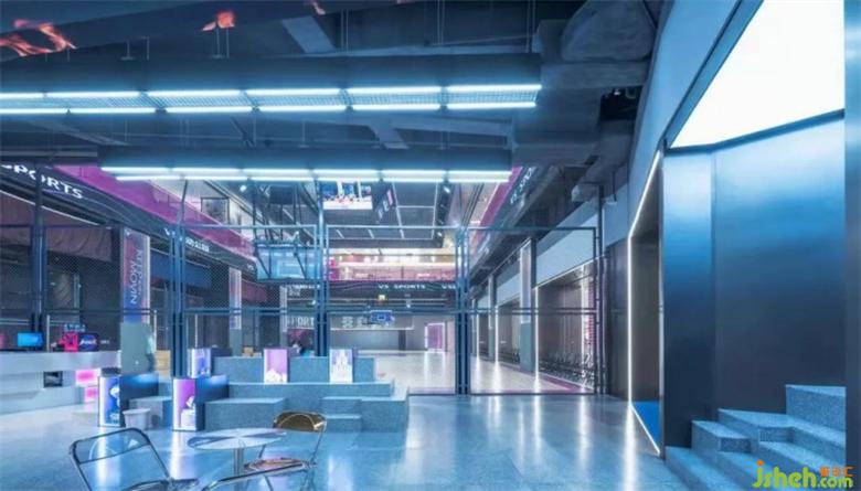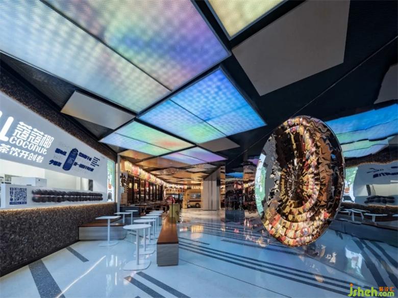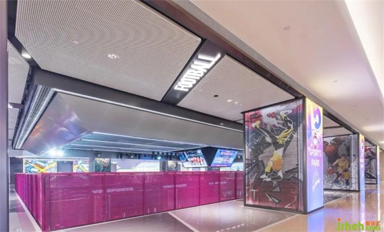 運用高飽和度的炫彩霓虹線性燈光,構(gòu)建娛樂性標語昭示面,形成強烈視覺焦點匯聚;商場設(shè)計天面嵌入金屬黑白撞色字母LED燈帶,與地面籃球、跑道等運動風格貼畫,打造時尚運動風格。