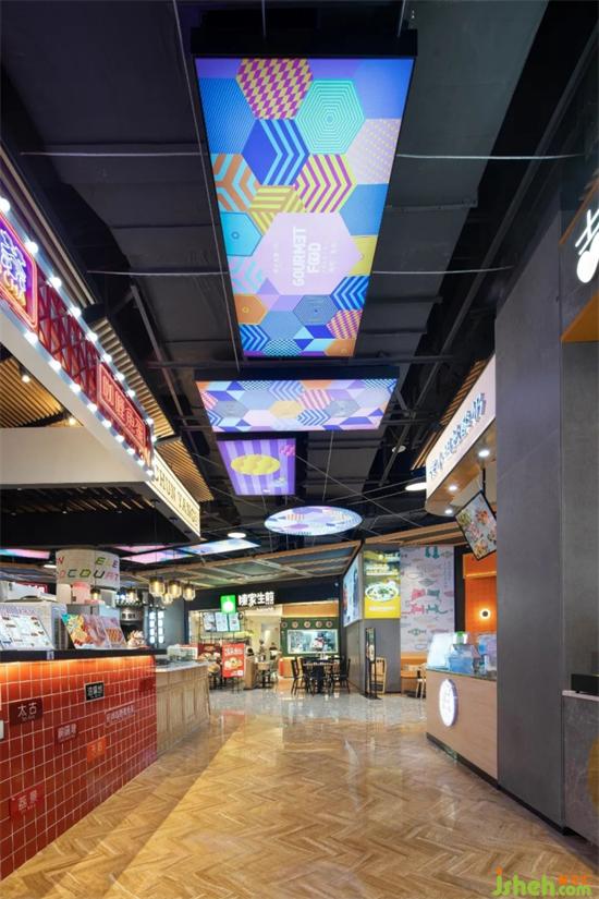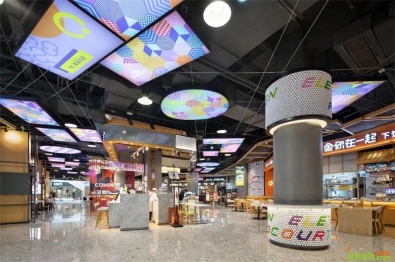 入口處由很多個不同顏色的高爾夫球組成的標(biāo)志性的大臺燈,散發(fā)出溫暖的光,美食廣場設(shè)計(jì)將大家?guī)胼p松愉悅的空間,從而開始美食之旅。