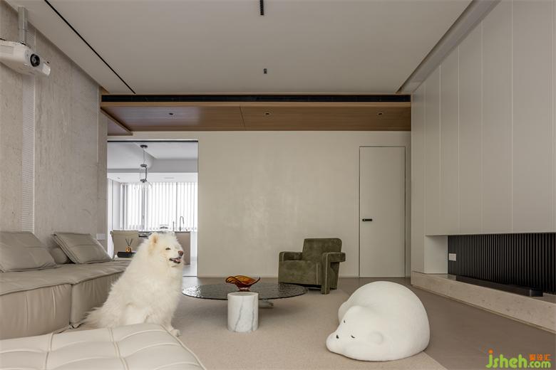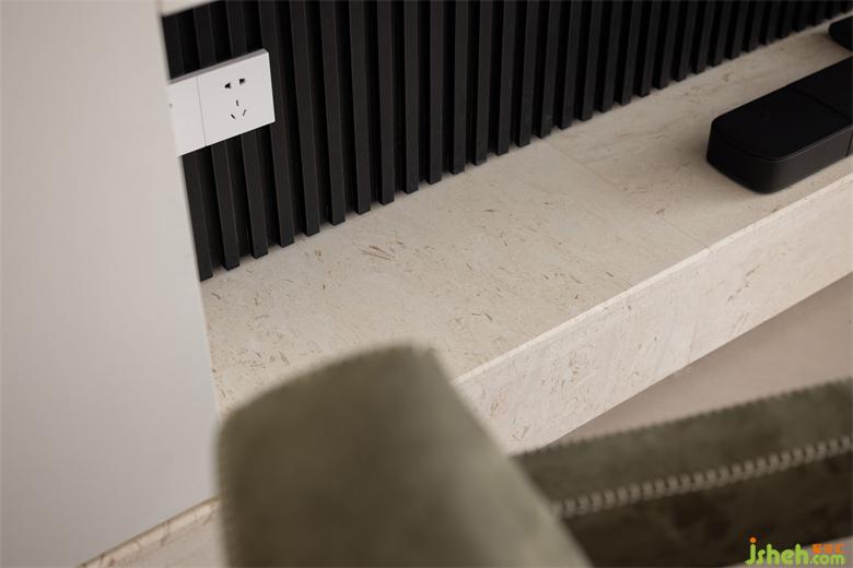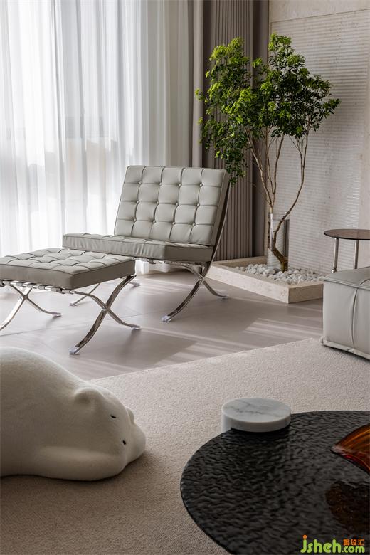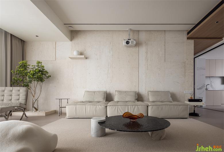 不規(guī)則的洞石背景是客廳的一大亮點(diǎn),展現(xiàn)天然材質(zhì)的本質(zhì)美,與米白色的藝術(shù)墻漆相輔相成,澄凈而溫柔,淡化都市與自然的界限。