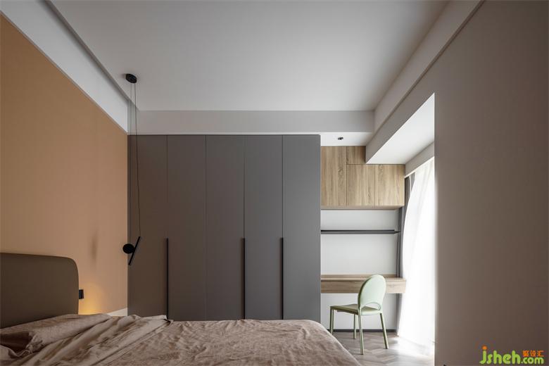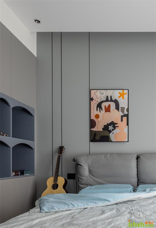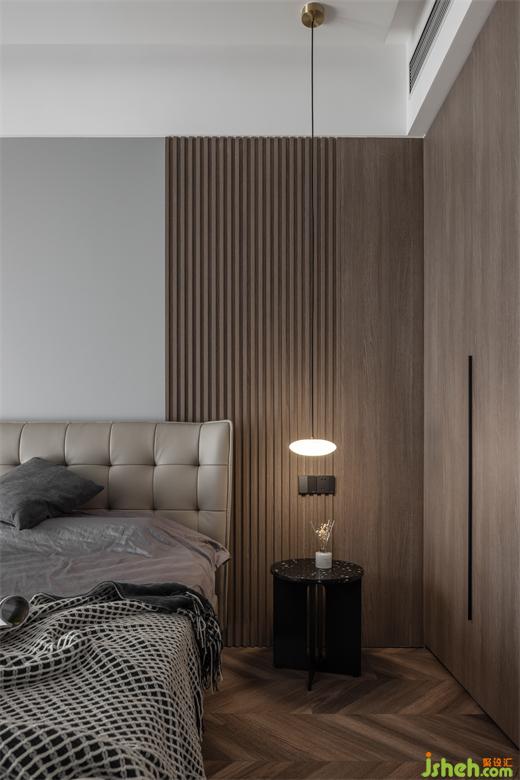 主臥內(nèi)斂灰色和胡桃木在規(guī)整中相互映襯靜謐的空間節(jié)奏加上藝術(shù)化的展示,設(shè)計師試圖通過純粹的視覺感官