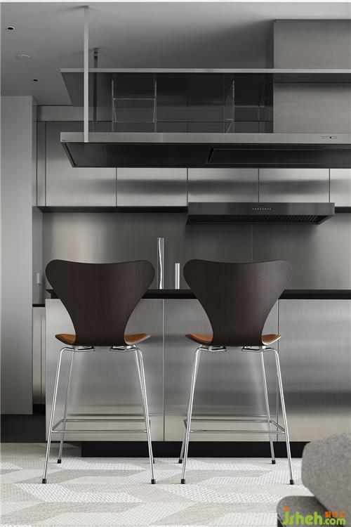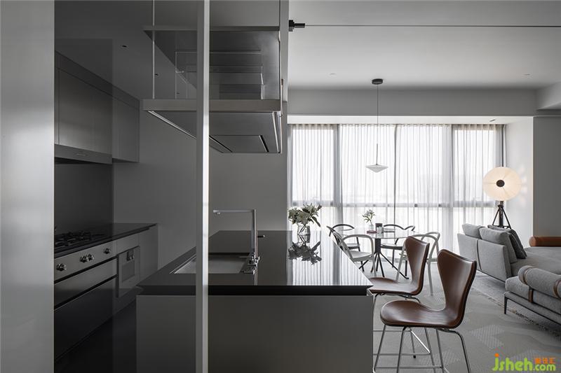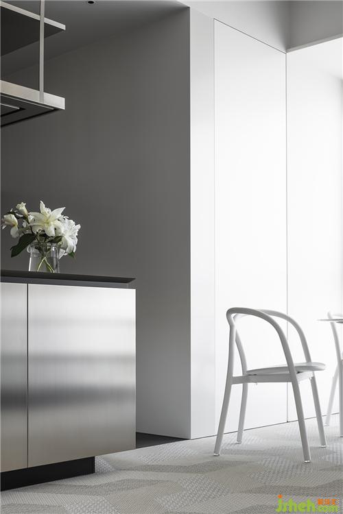 空間以經(jīng)典的黑白灰系作為主題配色,通過平衡三者之間的比例與面積,配合皮革、金屬和鏡面材質(zhì)的間奏,細(xì)細(xì)打磨出家的質(zhì)感。