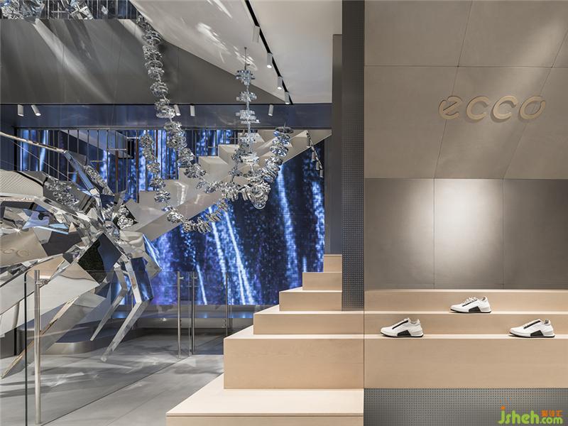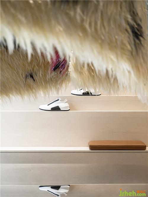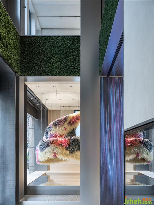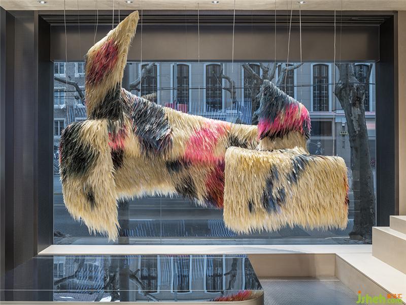 表面似羽毛的大型藝術(shù)裝置,運用180平米透明皮革,挑起觀者對皮革原有的感官認(rèn)知,通過材料關(guān)系與空間形式的層層矛盾感,上海店鋪裝修設(shè)計建立頗具戲劇性的商業(yè)空間體驗。