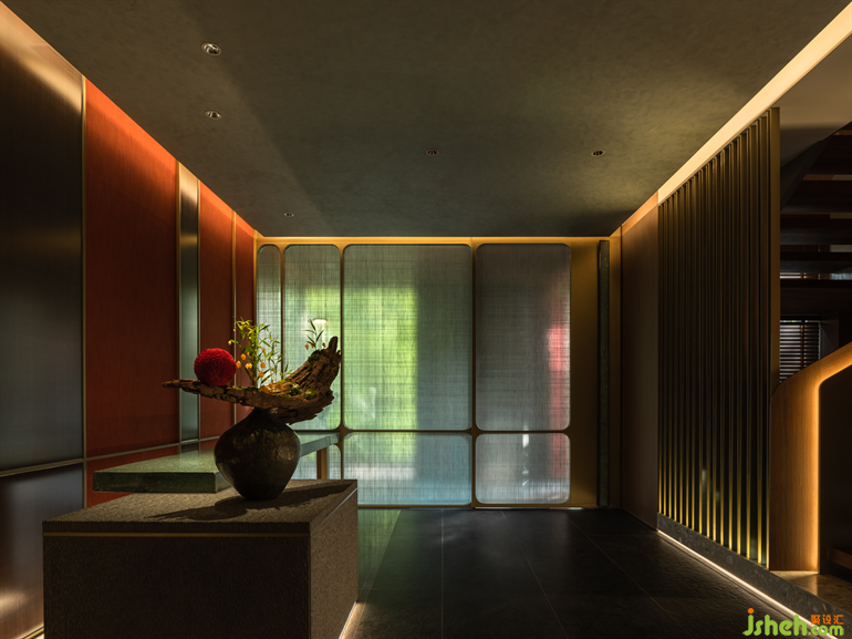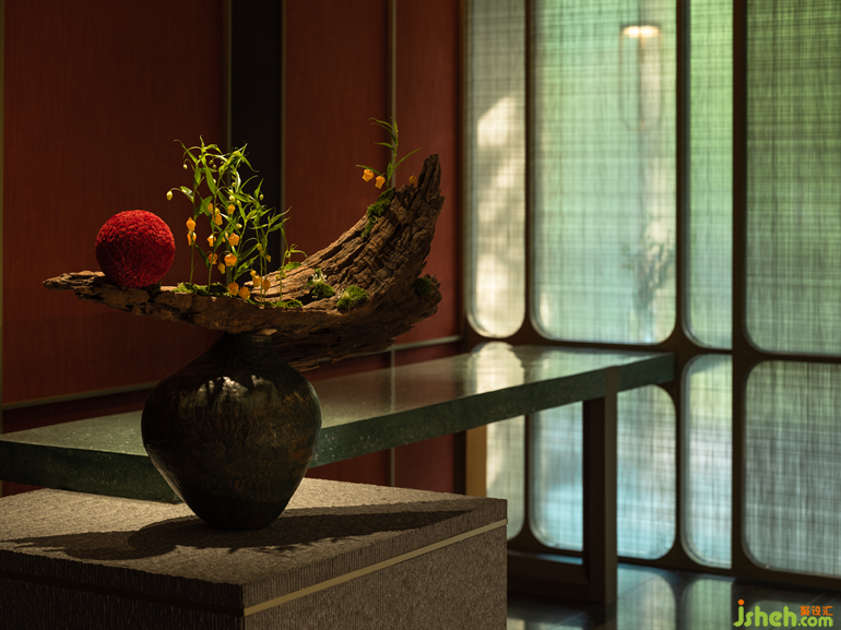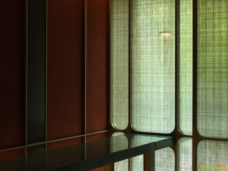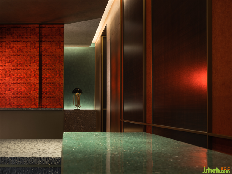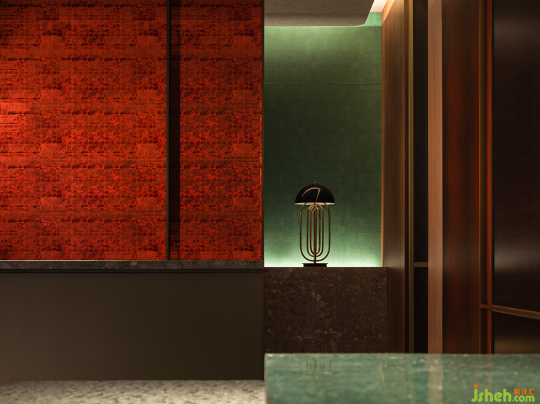 朱紅與翠綠、奢華與簡約、陽剛與陰柔,巧妙地營造了美的張力與平衡力。設(shè)計師以自然景觀為基礎(chǔ),再現(xiàn)了李唐文化中兼容并蓄、濃麗熱烈的一面。