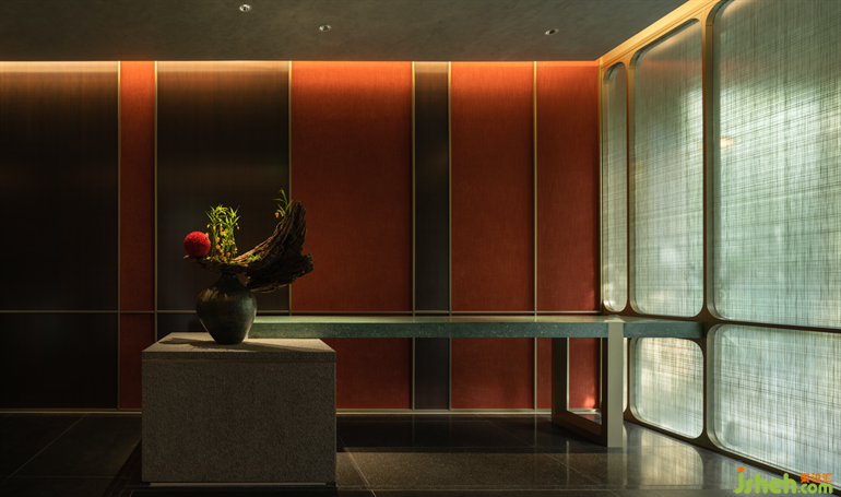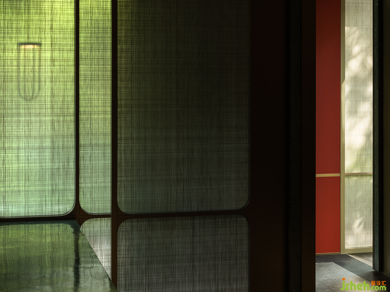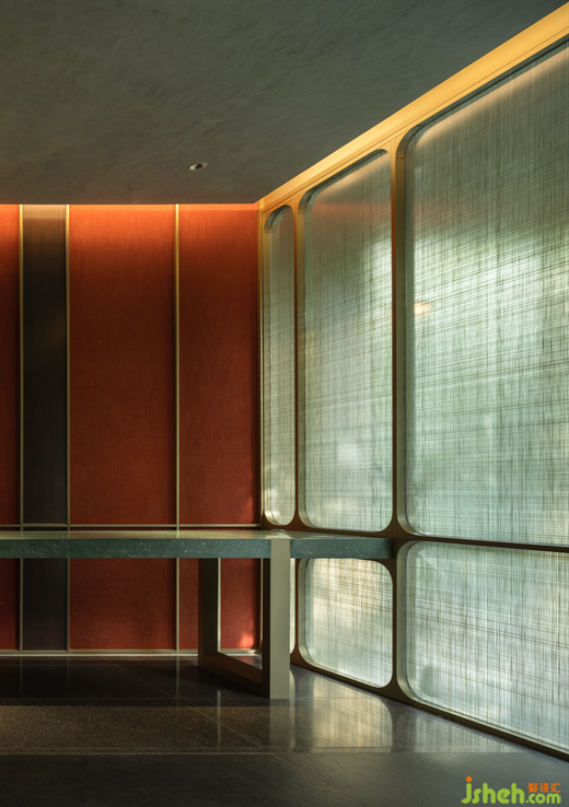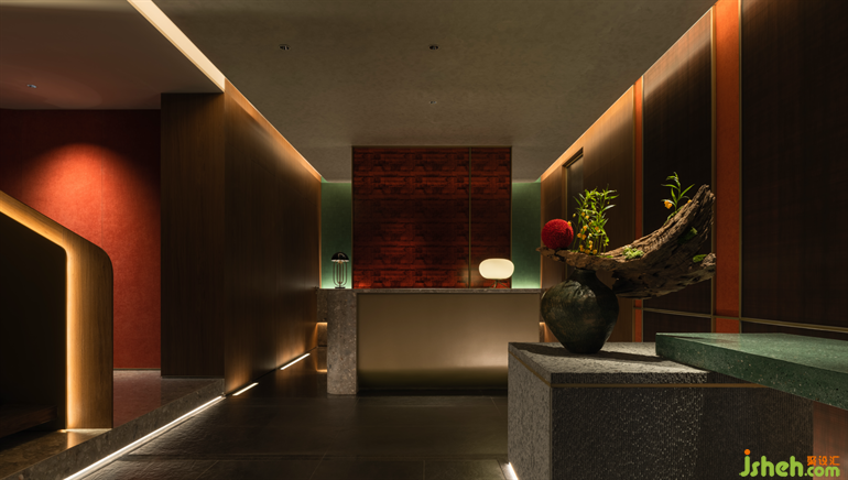 城市喧鬧被半透明的綠紗和一抹紅色的花藝盆景隔開。前臺接待區(qū)猶如一個三進的小院,隱藏于層層隔斷之下,并不急于讓人看清,卻散發(fā)出一種神秘而堅定的氣質(zhì)。