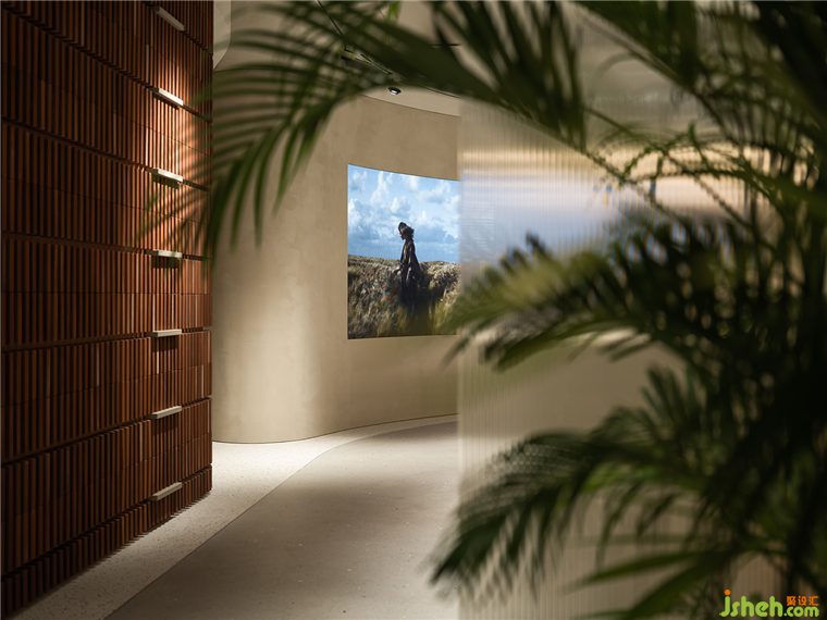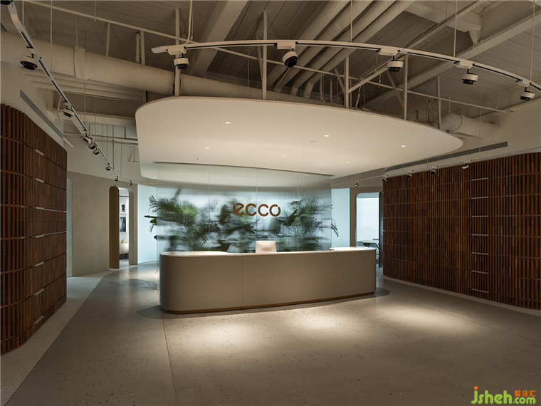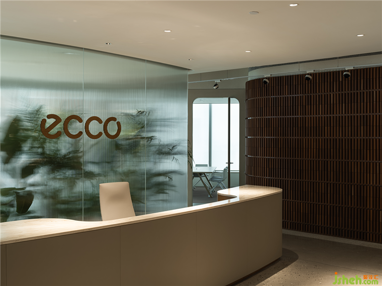 從電梯出來,迎面而來的就是ECCO的前臺,ECCO Forest以長虹玻璃和遠(yuǎn)處繁茂的綠色植物相結(jié)合,創(chuàng)造出一種熱帶雨林的氛圍。輔以ECCO精神內(nèi)含的「皮革創(chuàng)新」的接待臺是由高品質(zhì)的皮革材料制成,為空間增添了額外的優(yōu)雅氛圍。