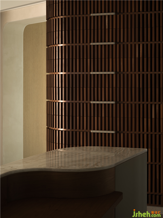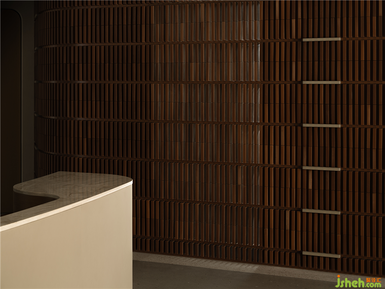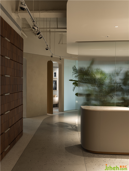 前廳空間的輪廓和場景的風(fēng)格通過光影相互作用而形成??偛哭k公室裝修設(shè)計在交互場景中,長虹玻璃和皮革、水磨石和木材的并置以極簡主義的方式為空間增添了一絲豐富感。