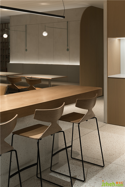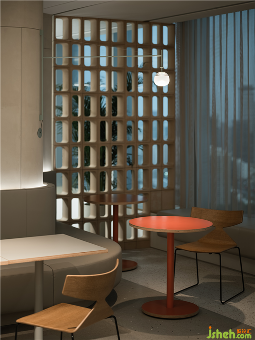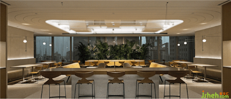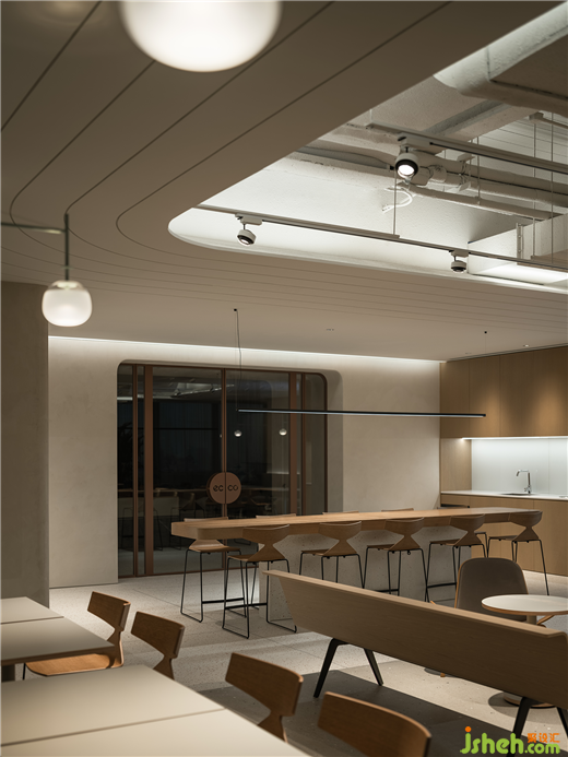 長木桌散發(fā)著冷靜和沉著的氛圍,珊瑚橙色圓桌毫不費力地突顯了區(qū)域,同時不顯得過于大膽。附近的落地窗采集自然光,為設計注入了獨創(chuàng)性,總部辦公室裝修設計營造了一個舒適和諧的環(huán)境。