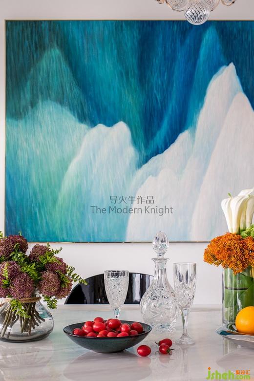 客廳精選了一幅意大利創(chuàng)意藝術(shù)家Fornasetti的經(jīng)典拼圖系列,餐廳的藝術(shù)畫作是我們工作室用找來的素材改良而成,靈感來自極光和《星際穿越》米勒星球的海浪,畫幅2.2米X1.4米,剛好能進(jìn)電梯,由Willart畫師繪制,筆觸細(xì)膩豐富,過道則用皮料打底的手工樹脂立體畫做點(diǎn)睛。
