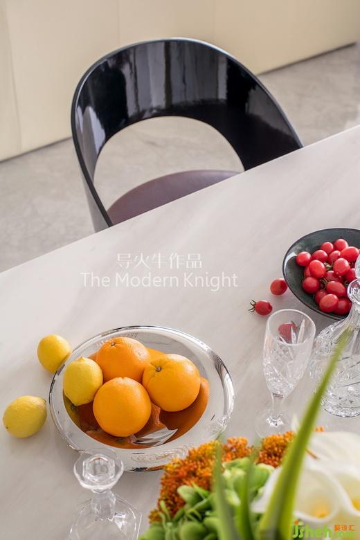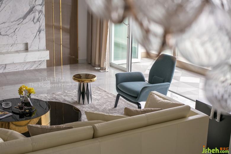 黑檀木和香檳金組合而成的雙層圓形茶幾,與柔美的象牙色真皮沙發(fā)和地毯形成剛?cè)岵?jì)的材質(zhì)對比