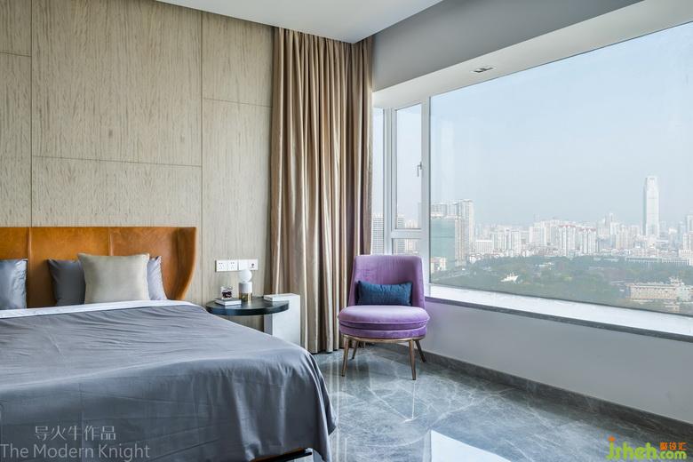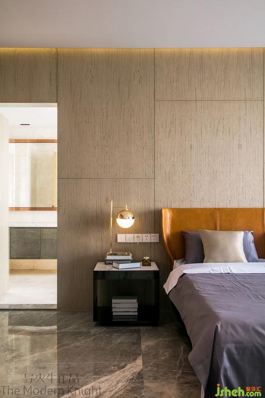 主臥搭配了灰斯影木、熏衣草色和橙色真皮床頭