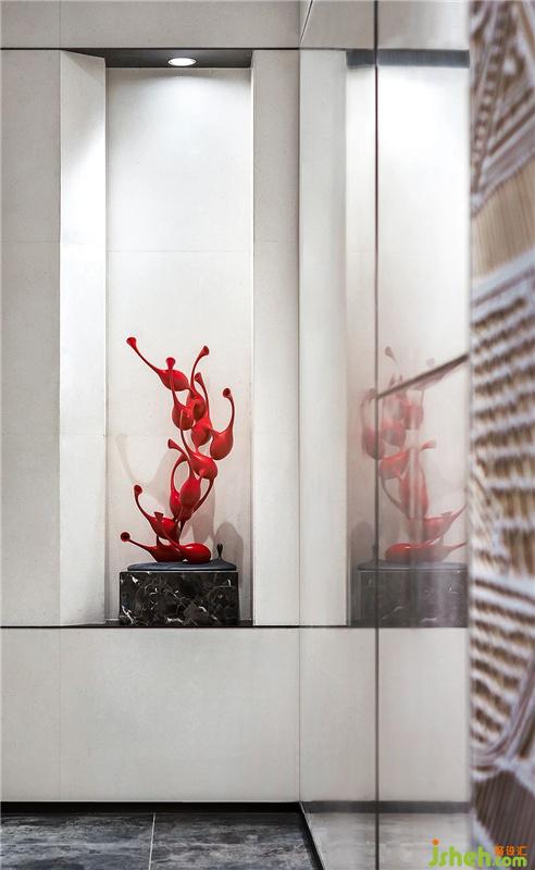 設(shè)計(jì)師撮要建構(gòu)出一個(gè)時(shí)空聚點(diǎn),與空間連成一片。接待前臺(tái)區(qū)以簡(jiǎn)潔利落引入,紅色的裝置以舟之形,顯競(jìng)之景,以形、意、境展現(xiàn)“龍舟競(jìng)渡”對(duì)于順德傳統(tǒng)文化不可或缺的意義深圳室內(nèi)裝修設(shè)計(jì)。