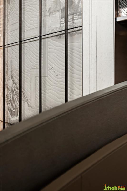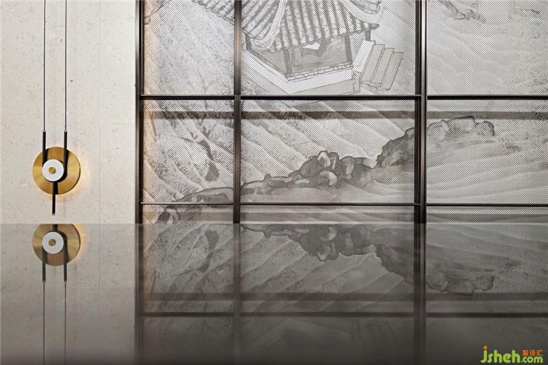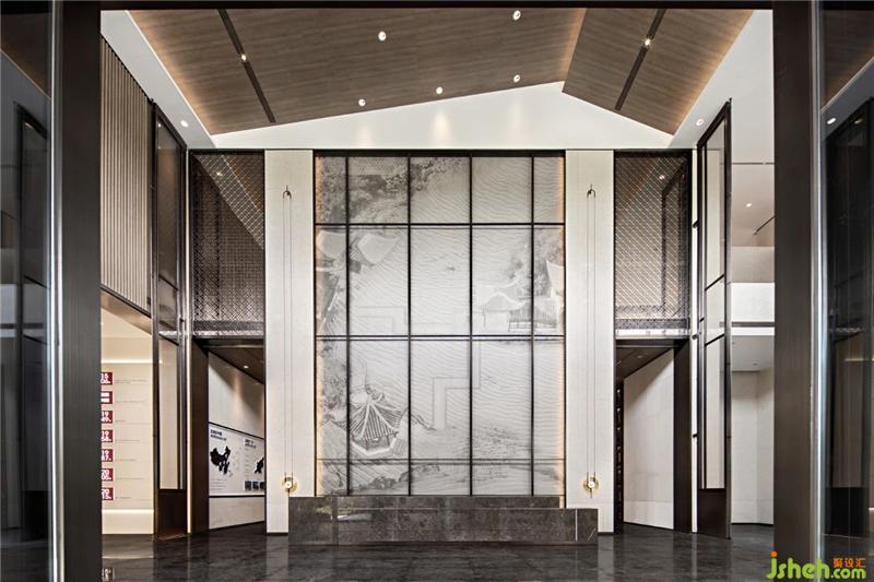 穿過園林前庭和曲折的連廊,來到接待前廳,移步深入,即可見沖孔網(wǎng)與背景的雙重疊加,恰似一道門廊,更是一重禮序,以現(xiàn)代手法引入嶺南建筑元素,在朦朧光影的烘托下,仿佛超越了時(shí)空的限制,將嶺南的歷史文化與風(fēng)土人情娓娓道來。