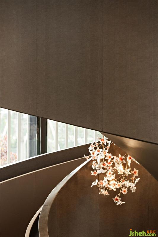 融入氛圍的藝術(shù)裝置一直是加法的呈現(xiàn),旋轉(zhuǎn)樓梯的吊燈融入了廣州市花“木棉花”的元素,木棉為形,光線為燈,斗轉(zhuǎn)星移,光影錯落深圳展廳設(shè)計(jì)。