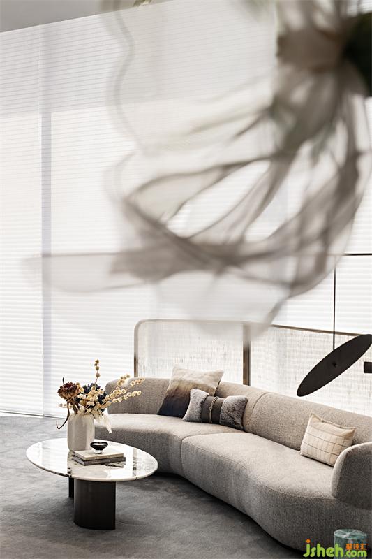 大面積的玻璃落地窗,讓自然光線進入,若即若離的景色變化以及戲劇性的情感體驗,激發(fā)訪者的想象情境;在樹影點光的映射下,置身于弧形洽談區(qū)之中,仿如被空間包裹著。營銷中心設計在弱化空間界限性的同時,希望訪者憑借內心的回憶為空間添上顏色。