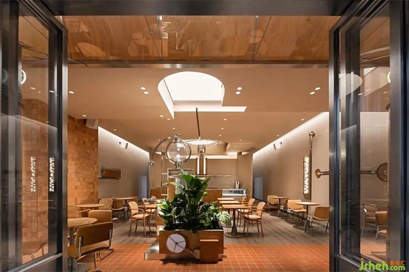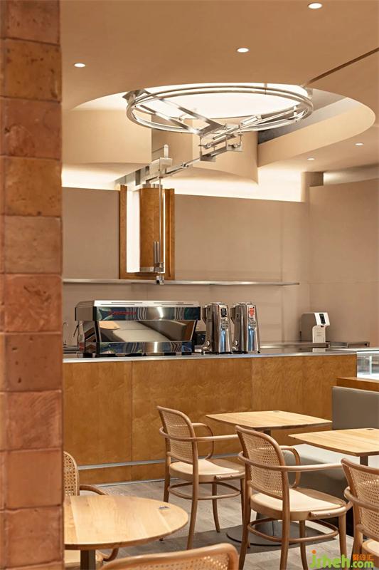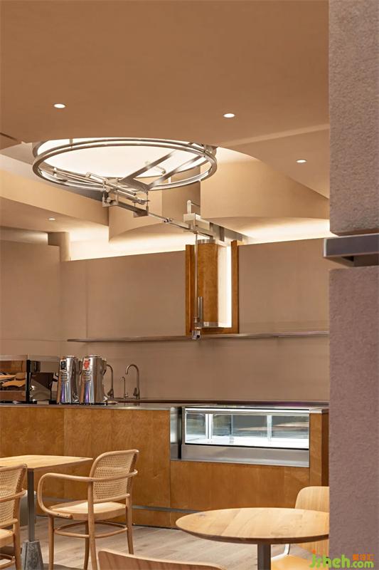 木與金屬、幾何形體與弧線穿插疊加,模糊空間邊界的同時,餐廳設(shè)計打造虛實交錯的沉浸式感官體驗。