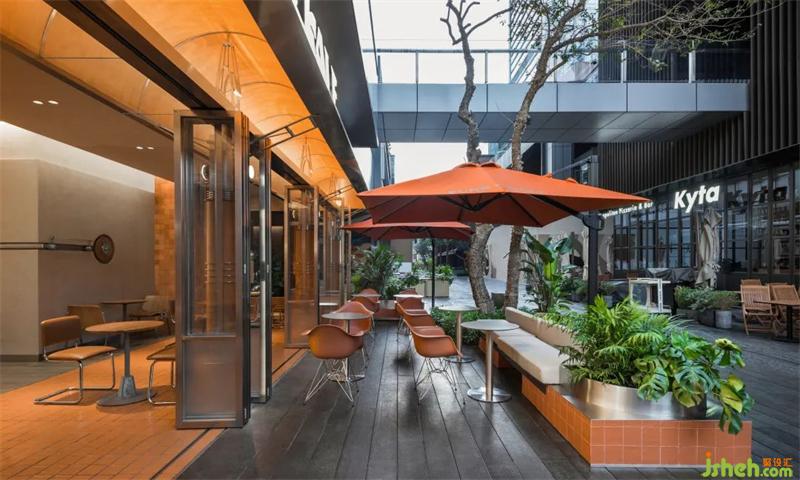 餐廳設(shè)計在整體開放式的空間中,功能區(qū)域以區(qū)塊疊進(jìn)的方式進(jìn)行分割,從戶外開放式推進(jìn)到半開放的后廚,推進(jìn)的秩序在結(jié)構(gòu)組合連接下形成動線節(jié)奏的循環(huán)。